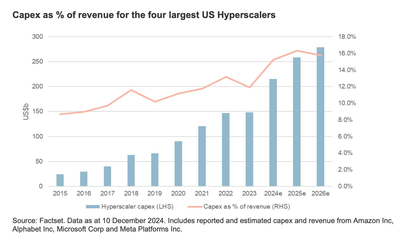 The lifecycle of AI applications can generally be broken into the training and inferencing phases.Due to the highly intensive computational requirements of AI training, it is generally reliant on hyperscaler data centres and hardware (such as semiconductors), and hyperscalers have deployed significant resources internally for AI training. Increased capital expenditure from major hyperscalers in 2024 is likely to be eclipsed by even larger investments expected in 2025 and 2026.