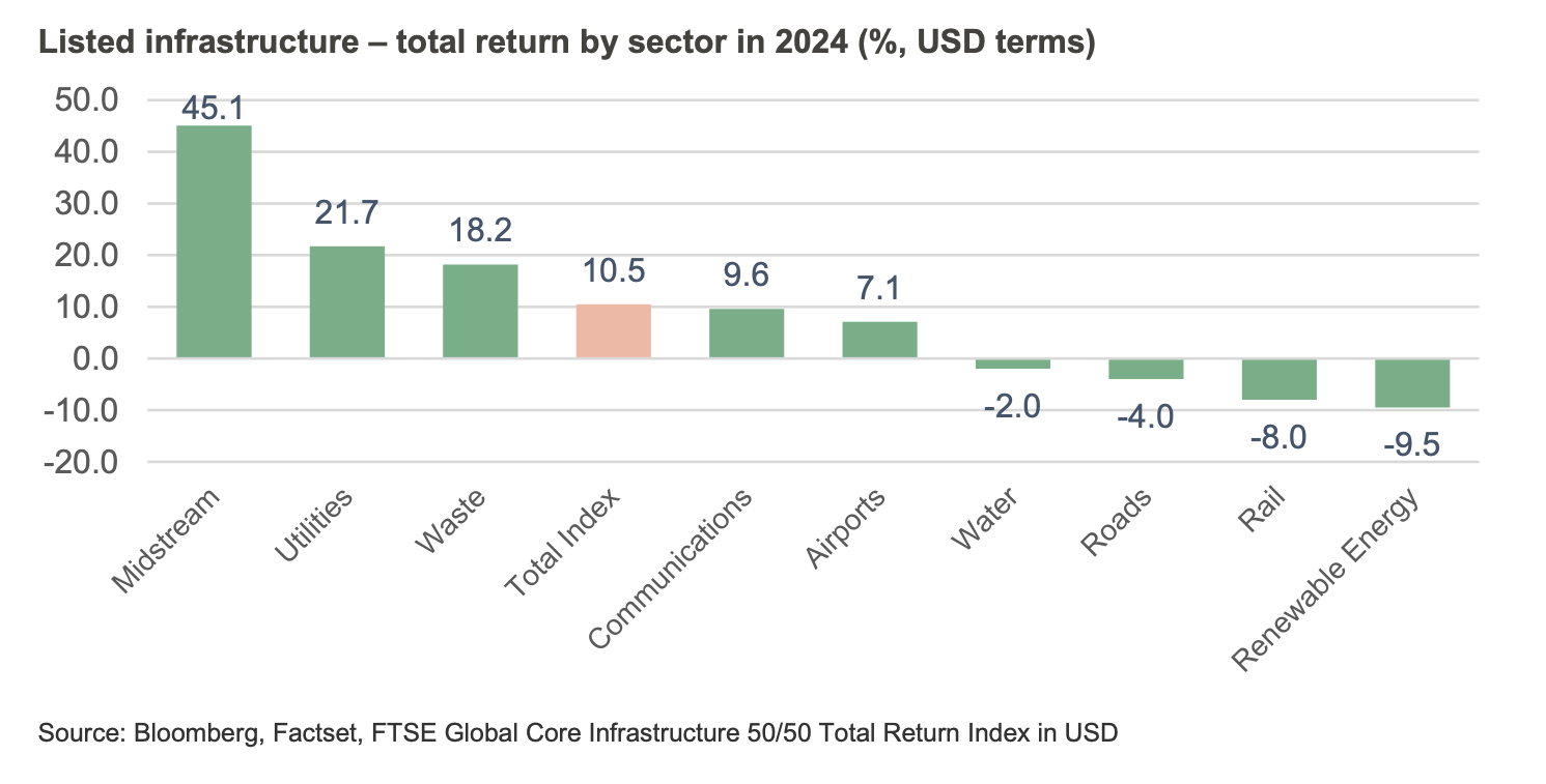Listed infrastructure returned ~10%[1] in 2024. However, returns across subsectors varied widely as shown below.